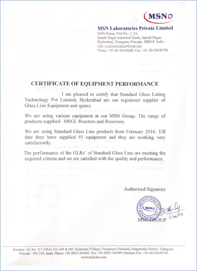 In a formal certificate issued by MSN Laboratories, the performance of the glass-lined reactors and receivers was confirmed to be in line with the company’s operational criteria. The equipment is working satisfactorily, and the certificate states that MSN is pleased with the quality and performance delivered by Standard Engineering Technology.